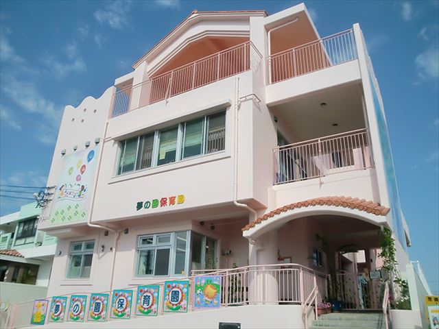 夢の園保育園は、平成20年4月1日に開園し、国、県、沖縄市の援助のもと、働く観や、その他の都合で、昼聞、保育できない方のお子様0歳児から4歳児の乳幼児をよりよい環境を整え、その中で園児一人ひとりが個性を発揮しながら心身共に順調で豊かな成長発達が出来るよう日々の保育に当たります。