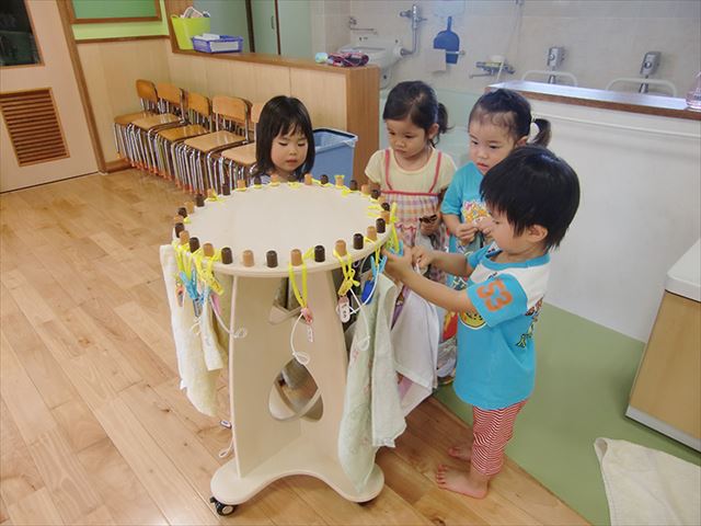 足腰を丈夫にし、手先を器用にするあそびをたくさんさせながら、基本的な生活習慣の自立を促す。保育士との応答の場を多く持ち、言語活動やあたたかな感情の芽生えを促す。